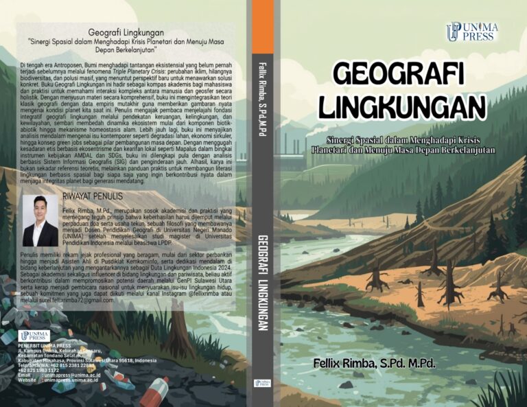 Penulis mengajak pembaca menjelajahi fondasi integratif geografi lingkungan melalui pendekatan keruangan, kelingkungan, dan kewilayahan, sembari membedah dinamika ekosistem mulai dari komponen biotik-abiotik hingga mekanisme homeostasis alam. Lebih jauh lagi, buku ini menyajikan analisis mendalam mengenai isu kontemporer seperti degradasi lahan, ekonomi sirkuler, hingga konsep green jobs sebagai pilar pembangunan masa depan. Dengan menggugah kesadaran etis berbasis ekosentrisme dan kearifan lokal seperti Mapalus dalam bingkai instrumen kebijakan AMDAL dan SDGs, buku ini dilengkapi pula dengan analisis berbasis Sistem Informasi Geografis (SIG) dan penginderaan jauh. Alhasil, karya ini bukan sekadar referensi teoretis, melainkan panduan praktis untuk membangun literasi lingkungan berbasis spasial bagi siapa saja yang ingin berkontribusi nyata dalam menjaga integritas planet bagi generasi mendatang.